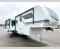 A perfect fifth wheel featuring triple slides and a tri-fold sofa for overnight guests! You will love the spacious interior thanks to the dual opposing slides in the main living and kitchen area. Here you will find a kitchen island in the center and plenty of seating with a free standing dinette, theater seating for movie night opposite the fireplace and entertainment center, as well as a tri-fold sofa. The kitchen offers all of the amenities just like home, a 16 cu. ft. 12-volt refrigerator for your perishables, and a hutch with an electronics drawer to keep your gadgets organized. There is even a pet dish under the refrigerator for your furry friends. The spacious full bath includes a 48" x 30" shower, dual linen closets, and an accessory drawer for necessities. You'll love the front bedroom with its queen bed slide out, slide top dresser, front wardrobe with washer and dryer prep, plus a pass-thru clothes hamper between the bedroom and bath; how convenient!